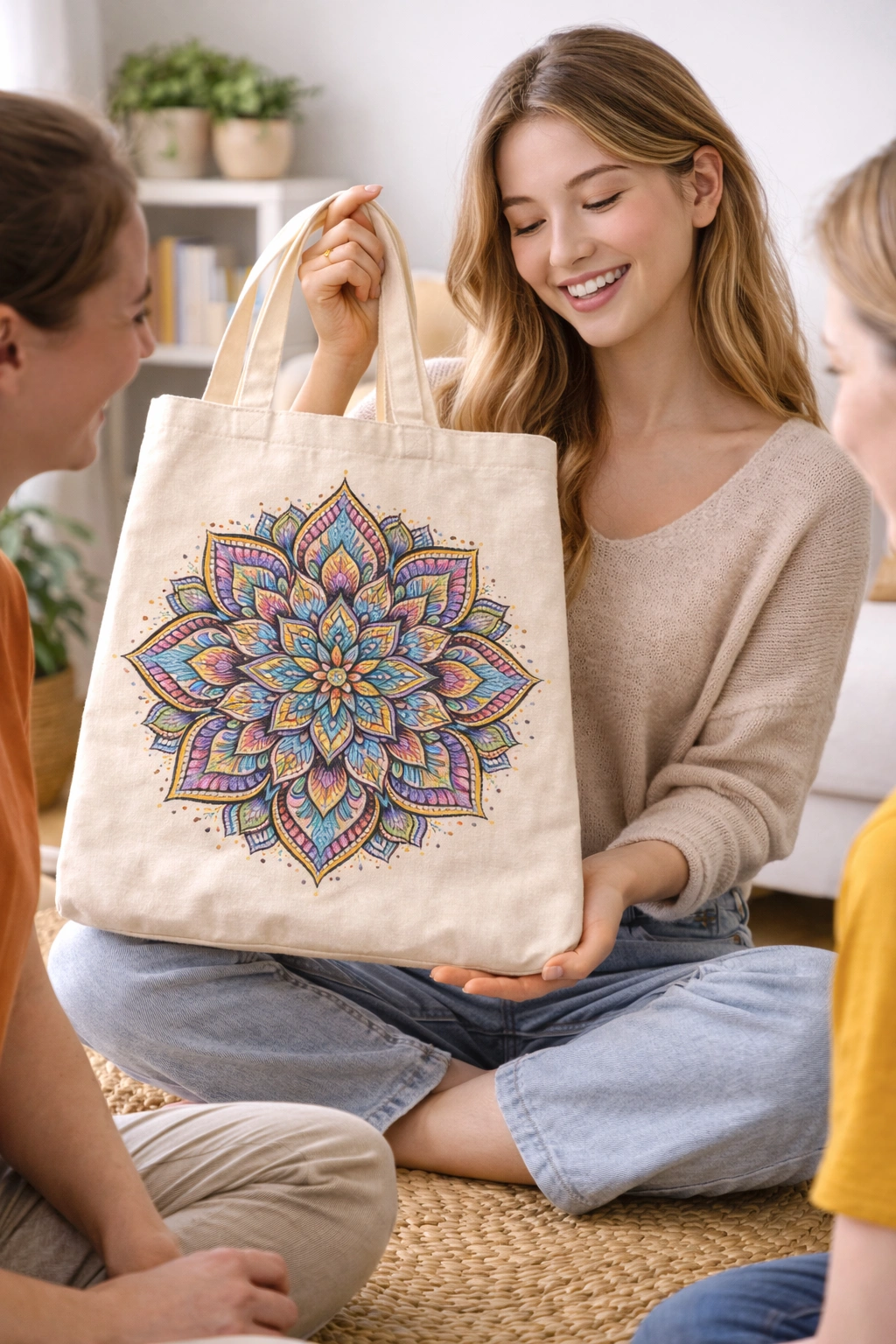 Apply your mandala design onto a cotton tote bag to create a stylish, personalized accessory.